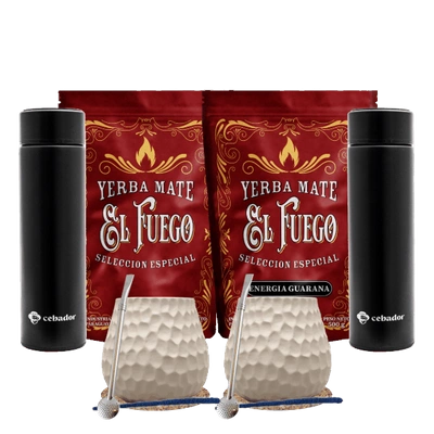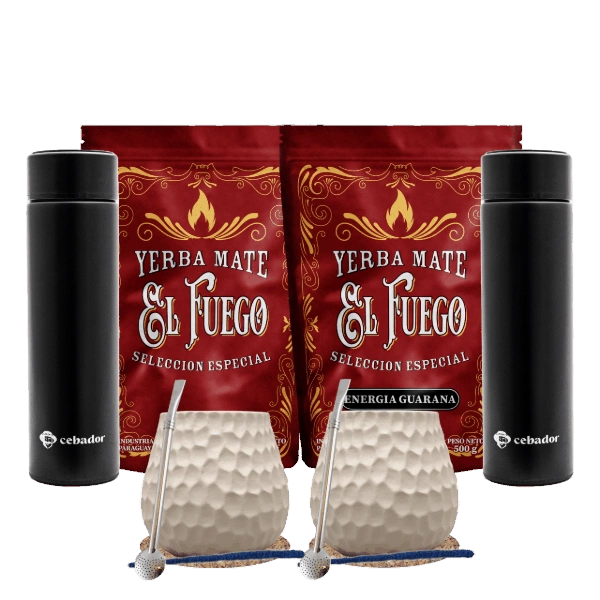 Set Yerba Mate per due: El Fuego 2x500g + 2x Thermos LED + 2x Tazza di mate + 2x Bombilla