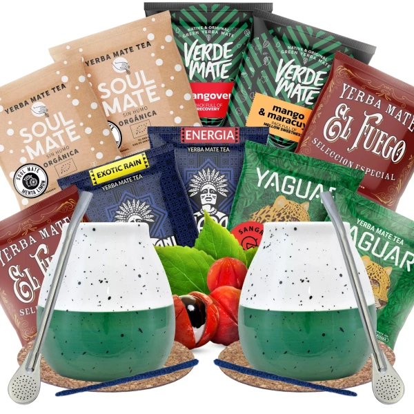 Nota che i nomi dei singoli gusti dei campioni di yerba mate sono riportati sull'etichetta nella parte posteriore, accanto alle informazioni sugli ingredienti.