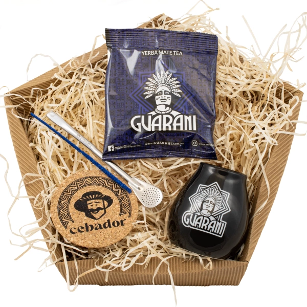 Nota che i nomi dei singoli gusti dei campioni di yerba mate sono riportati sull'etichetta nella parte posteriore, accanto alle informazioni sugli ingredienti.