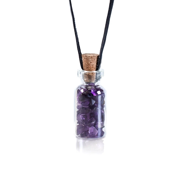 Forma: ametista naturale racchiusa in una bottiglia di vetro con cordoncino