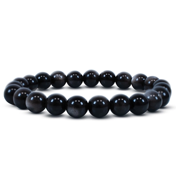 - Bracciale in ossidiana naturale argentata. Classico e minimalista, si distingue per la sottile lucentezza metallica. La varietà argentata dell'ossidiana favorisce il radicamento e il senso di stabilità.